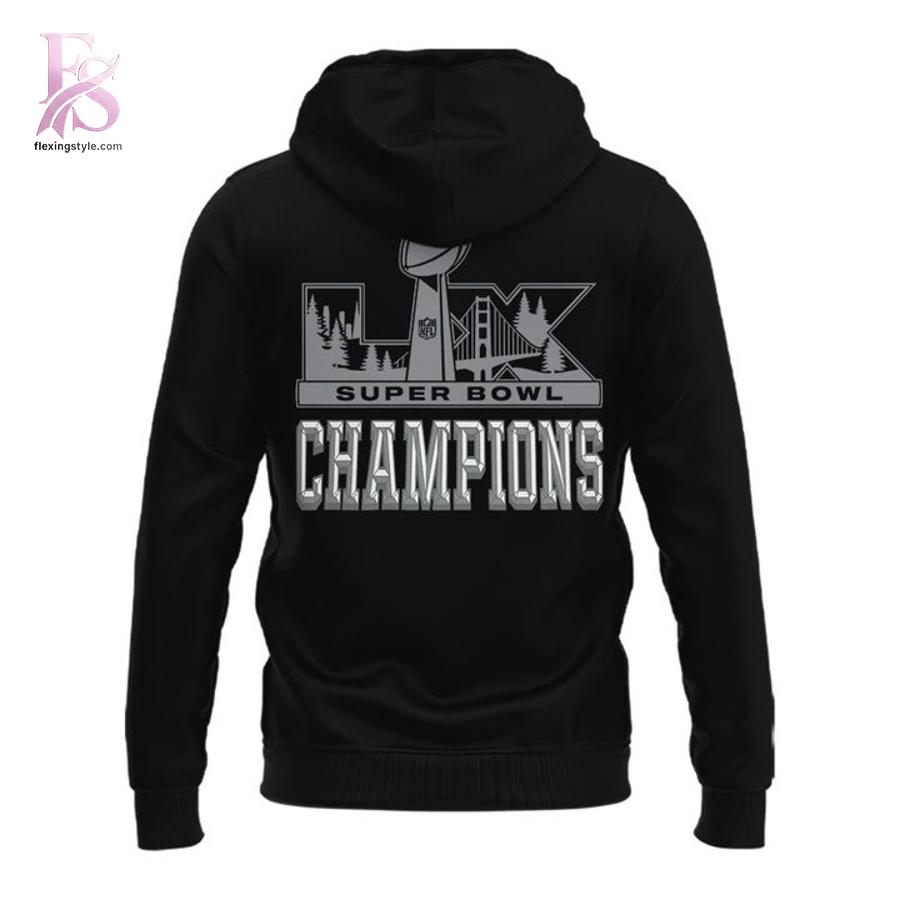 Turn it around, and the back continues the celebration. A large “LX” graphic anchors the design, accented with championship-themed elements and “SUPER BOWL CHAMPIONS” text that stretches confidently across the shoulders. The monochrome silver-gray print against the black fabric creates a sleek, modern look that feels both commemorative and timeless.