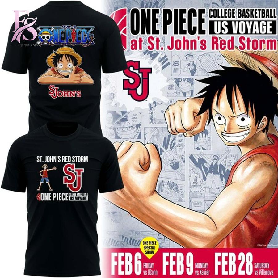 The design of the St. John’s Red One Piece 2026 Shirt features high-fidelity graphics that pop against a sleek, premium black fabric. The front showcases a custom illustration of Luffy flexing his signature “Gum-Gum” strength alongside the iconic St. John’s “SJ” logo, symbolizing a shared quest for victory and greatness. Moving to the back, the shirt pays homage to the 2026 tour with the official One Piece US Voyage branding and the Red Storm’s legendary moniker. This isn’t just standard fan gear; it is a meticulously crafted piece of history that marks the intersection of the world’s most popular manga and the high-stakes world of Big East basketball.
