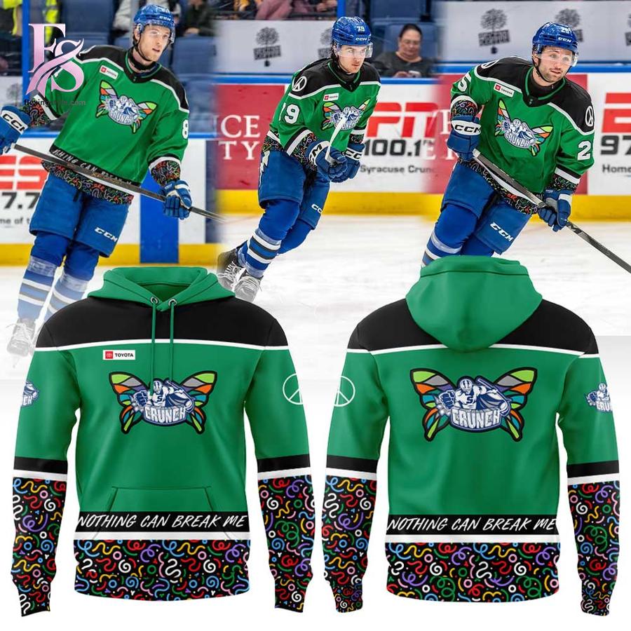 The image reveals a striking design that instantly stands out. The hoodie features a bold green base paired with sleek black shoulder panels and crisp white stripe accents across the chest and sleeves. At the center, the iconic Syracuse Crunch logo is reimagined with colorful butterfly wings-symbolizing growth, resilience, and transformation. The lower portion of the hoodie and sleeves bursts with a playful, multicolor abstract pattern, adding a lively, expressive touch. Across the hemline, the empowering phrase “Nothing Can Break Me” reinforces the Mental Wellness Night message, turning this hoodie into more than just apparel-it’s a statement.