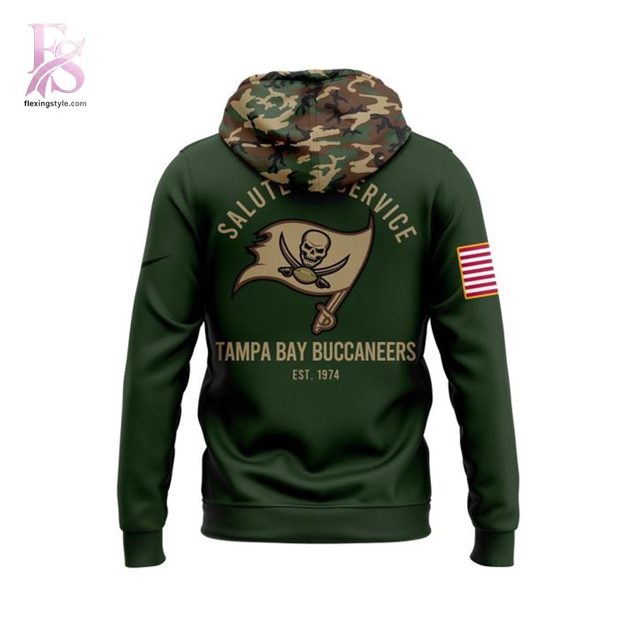 The back highlights a bold, oversized Buccaneers flag graphic surrounded by “Salute to Service” lettering and “Tampa Bay Buccaneers – Est. 1974,” giving the hoodie a distinctive, commemorative feel. The camo-patterned hood and matching kangaroo pocket offer eye-catching contrast, blending rugged texture with modern NFL style. Whether you’re heading to the stadium, gearing up for Veterans Day, or simply elevating your everyday look, this hoodie delivers standout versatility.
