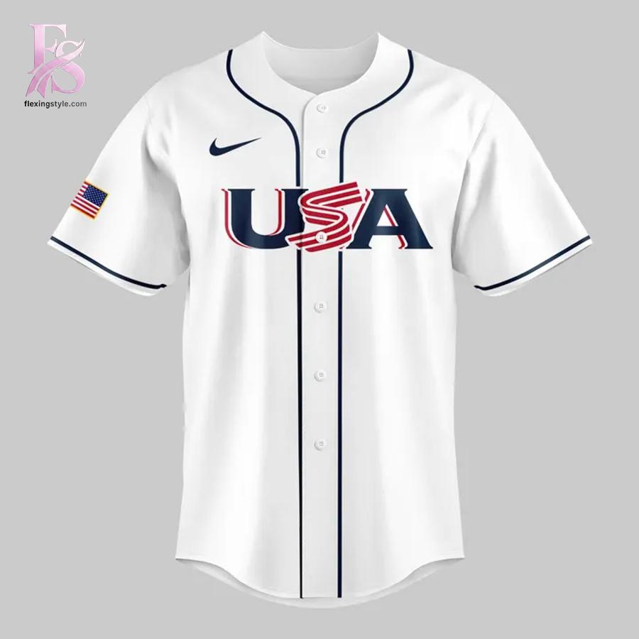 Visually electrifying, the crisp white base pops against bold navy blue piping along the edges, creating a clean, professional silhouette. The front’s iconic “USA” lettering weaves in red accents for a subtle flag motif, evoking national unity and power, with a tiny American flag sleeve patch adding that extra touch of patriotism. Personalize the back with your name and number in classic arched font, and note the vibrant multicolored logo at the collar – a nod to global competition. The smooth texture and tailored fit blend retro baseball vibes with modern flair, turning heads wherever you go.