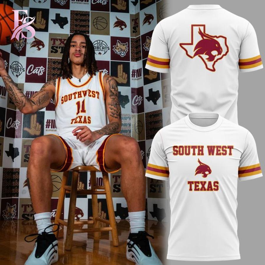 Visually, it’s a standout: the crisp white body pops with bold maroon and gold stripes along the sleeves and hem, evoking old-school varsity uniforms. On the back, “SOUTH WEST TEXAS” curves proudly in maroon block letters above a snarling bobcat silhouette fused into the iconic Texas state shape, adding a textured, embroidered-like depth that feels premium. Subtle details like the ribbed cuffs lock in that authentic throwback vibe, stirring up memories of buzzer-beaters and Bobcat victories.