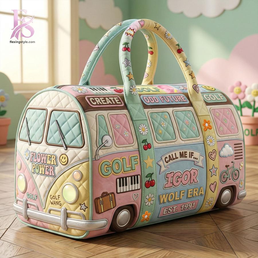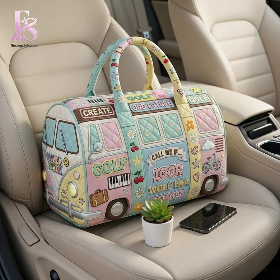 What truly sets this bag apart is its vibrant, retro-inspired design. Styled like a whimsical vintage van, the bag features a pastel color palette of mint green, soft pink, buttery yellow, and cream. Each panel is filled with charming details-playful flowers, cherries, stars, and quirky icons-alongside bold text elements like “CREATE,” “ODD FUTURE,” “GOLF,” and “IGOR WOLF ERA EST. 1991.” The quilted stitching adds depth to the design, giving it a cozy, handcrafted aesthetic that feels both nostalgic and fresh. Every angle reveals something new, making it a true conversation piece.