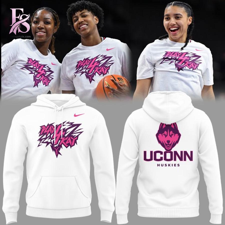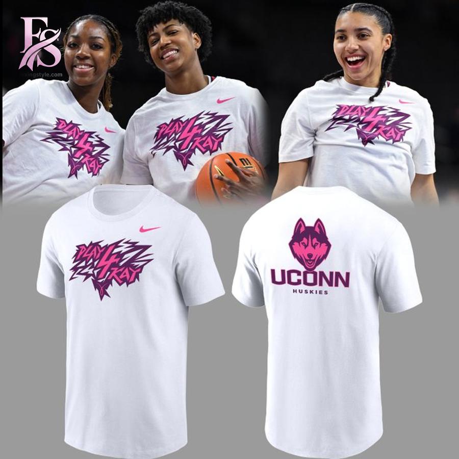 The front design features the bold “Play 4 Kay” graphic in striking pink tones, symbolizing strength, awareness, and solidarity. The dynamic, energetic lettering instantly draws the eye, while the clean white base keeps the look modern and versatile. On the back, the iconic UConn Huskies logo stands proudly, reinforcing your connection to one of the most respected programs in college sports. Every detail is thoughtfully placed to balance style, meaning, and unmistakable team identity.