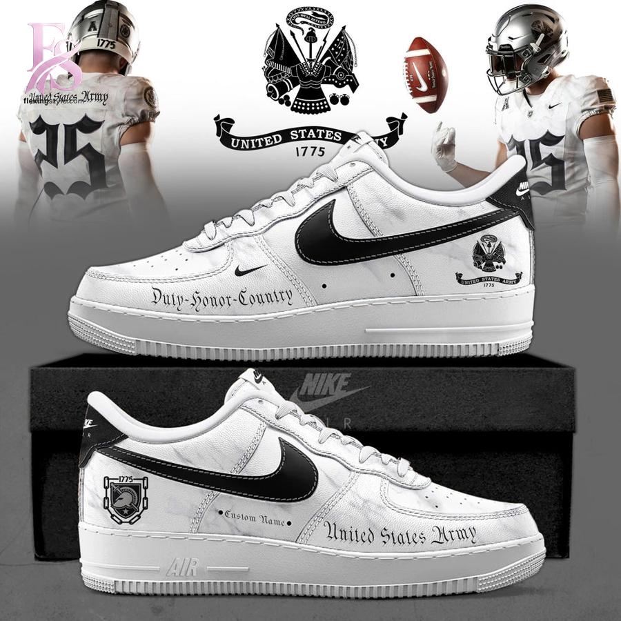 Based on the iconic Nike Air Force 1 low-top, these sneakers feature premium white leather with a subtle marble texture evoking solemn remembrance. Bold black accents highlight the swoosh, while authentic United States Army emblems – including the official Department of the Army seal with crossed flags, cannon, and drum – grace the sides. The timeless motto “Duty • Honor • Country” is elegantly scripted across the midsole, paired with “United States Army” lettering and the historic “1775” shield marking the Army’s founding. A customizable name option adds a personal touch, making these US Army custom sneakers a meaningful way to showcase unwavering patriotism and support for our troops.