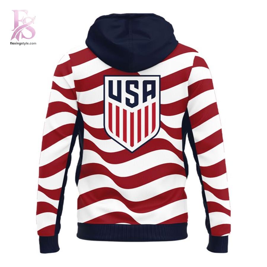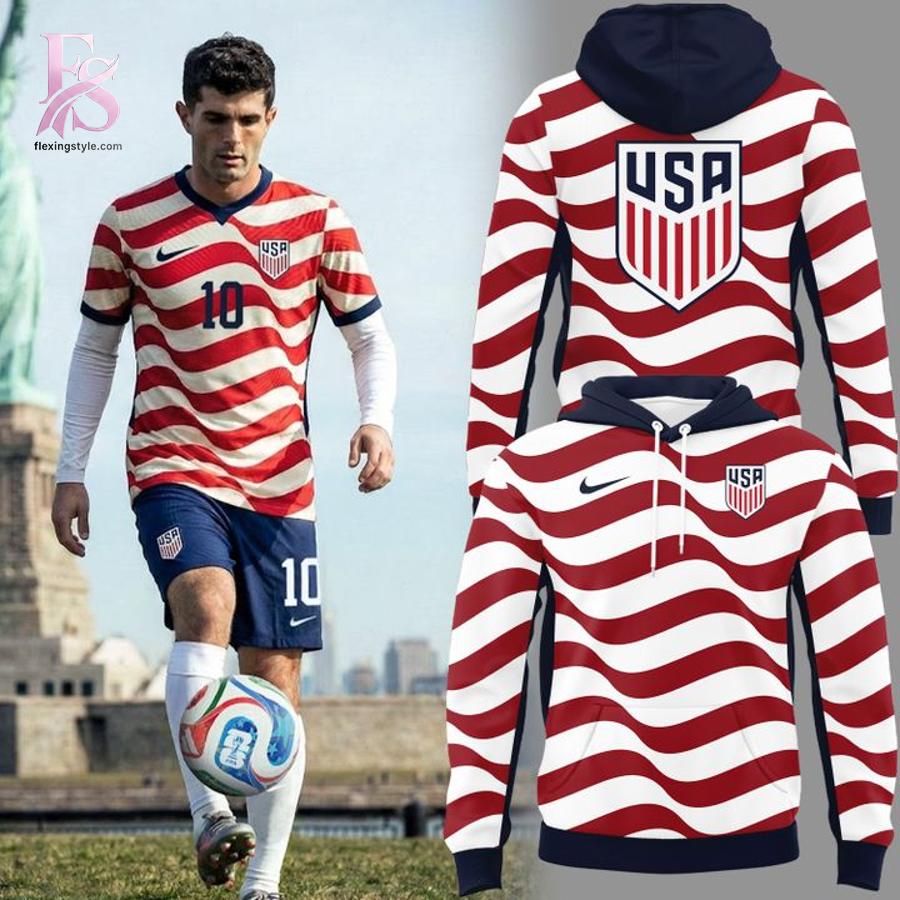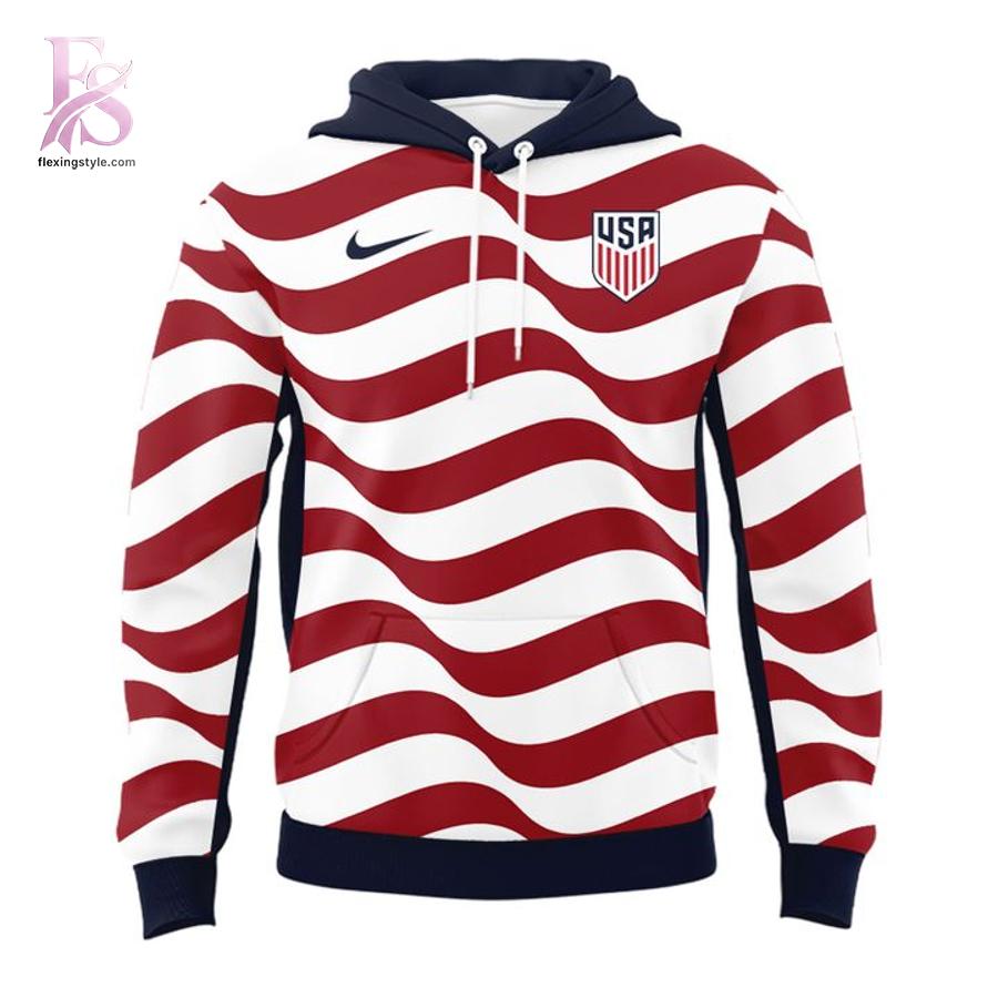 This hoodie captures the electrifying look of the Stars and Stripes uniform with bold, wavy red-and-white horizontal stripes that flow across the chest and sleeves, creating a dynamic, motion-inspired pattern that screams national pride. The large, centered USA shield pops in navy, white, and red, complete with stars and subtle detailing for authentic team authenticity. Navy accents on the drawstring hood, cuffs, hem, and inner lining add sharp contrast and a premium athletic feel, while the Nike swoosh nods to the official sponsor without overpowering the design.