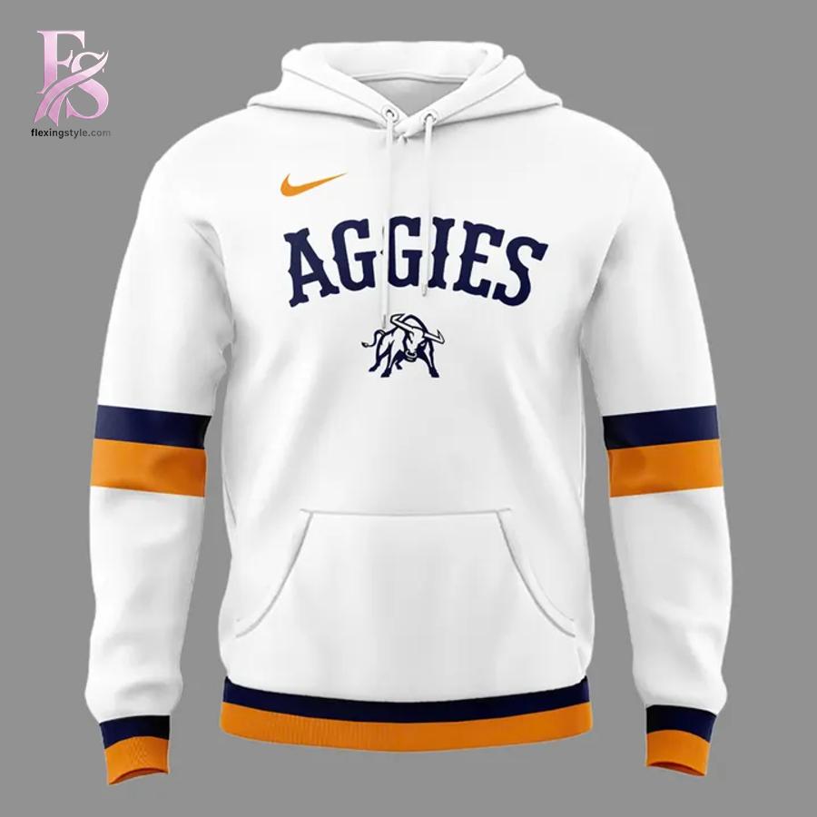 Right away, the crisp white base gives the hoodie a fresh, athletic feel that mirrors the Aggies’ on-court uniforms. On the front, bold navy “AGGIES” lettering stretches across the chest in a strong collegiate font, paired with a small mascot graphic beneath for an authentic, heritage look. The back makes an even bigger statement, featuring a large retro-style Aggies bull mascot above a flowing script logo, creating that throwback energy fans love. Navy and gold sleeve stripes add striking contrast, echoing Utah State’s team colors and giving the hoodie a true basketball warm-up vibe.